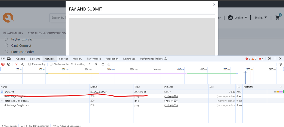 Refer - See , the authorizenet iframe is shown as blocked in status.