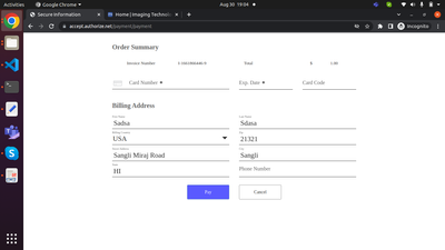 <!DOCTYPE html> <html> <meta name="viewport" content="width=device-width, initial-scale=1, maximum-scale=1, user-scalable=0"> <head> </head> <body> <form method="post" action="https://accept.authorize.net/payment/payment" id="formAuthorizeNetPage" name="formAuthorizeNetPage"> <input type="hidden" name="x_logo_URL" value="https://secure.authorize.net/mgraphics/logo_222222_1.jpg"> <input type="hidden" name="token" value="SBJMNcjP..." /> Continue to Authorize.net to Payment Page <button id="btnContinue">Continue to next page</button> </form> </body> </html>