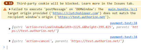 When the form loads I receive the message "Failed to execute 'postMessage' on 'DOMWindow'... I think that message is because the iFrame didn't finish loading yet. Not sure if it could be part of the issue since the Content Security Policy on the Apache server is set up as following: Header set Content-Security-Policy "frame-ancestors 'self' \*.authorize.net"
