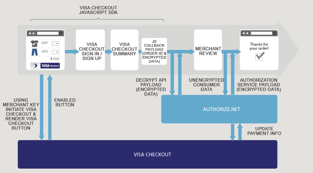- Authorize.Net provides the decrypt Visa Checkout data service, which decrypts the Visa Checkout payment data. You can use the decrypted data to help the customer confirm the purchase.
